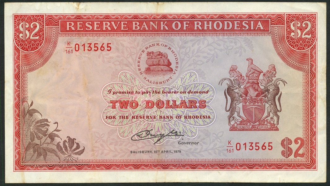 Reserve Bank of Rhodesia, $2, 10 April 1974, serial number K/161 013565, red on multicolour underprint, arms at right, bank title top centre, value in three corners and at centre, reverse, Victoria Falls