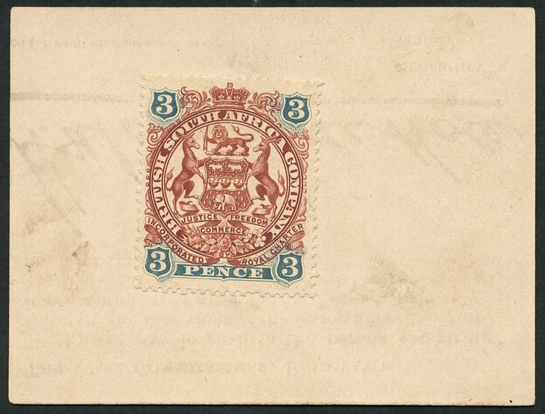 Rhodesian Postage Stamp Money, Marshall Hole, 3d stamp on pale tan card, Bulawayo, ND (9 April 1900), black text on tan, oval handstamp ADMINISTRATOR'S OFFICE BULAWAYO and black facsimile signature of Hugh Marshall Hole, the Government secretary to Matabeleland, reverse a British South Africa Company 3d stamp of 1896 affixed at centre