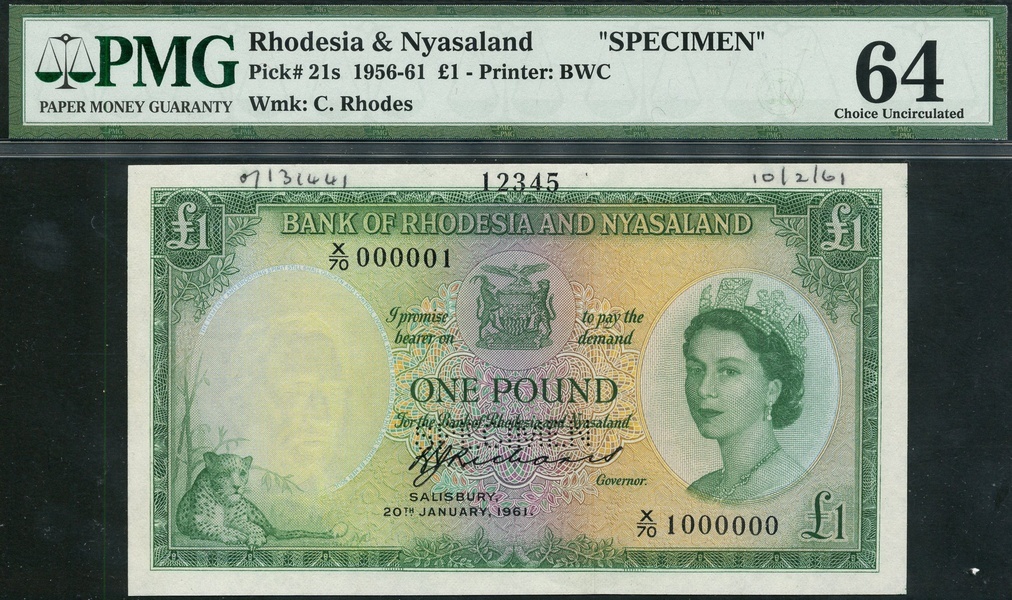 Rhodesia and Nyasaland, specimen £1, 20 January 1961, serial number X/70 000001 - X/70 1000000, blue on multicolour underprint, portrait Queen Elizabeth II at right, arms top centre, sable antelope at low left, reverse, Victoria Falls