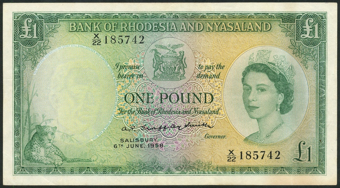 (x) Rhodesia and Nyasaland, £1, 6 June 1958, serial number X/22 185742, green on light green and yellow underprint, portrait Queen Elizabeth II at right, bank title top centre with arms below, leopard low left, reverse, Great Zimbabwe ruins
