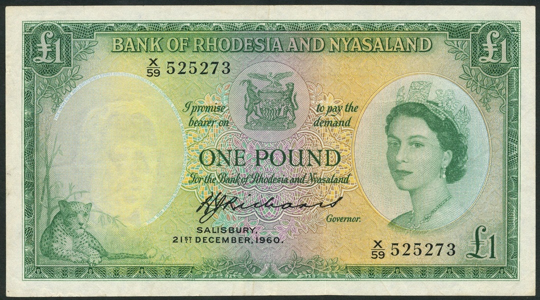 (x) Rhodesia and Nyasaland, £1, 21 December 1960, serial number X/59 525273, green on multicolour underprint, portrait Queen Elizabeth II at right, arms top centre, leopard low left, Richards signature, reverse, Great Zimbabwe ruins