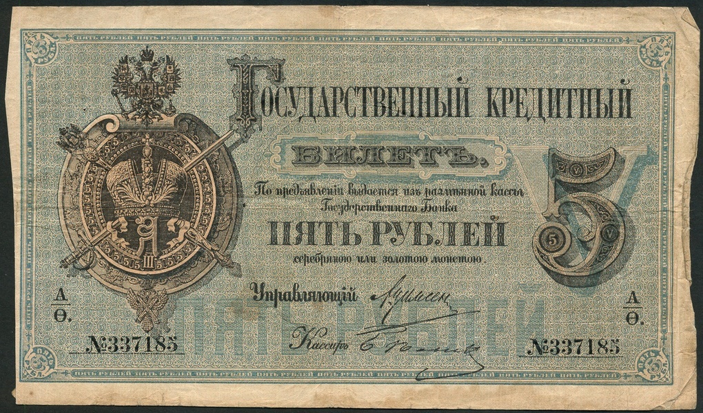 Russia, State Credit Note, 5 rubles (2), 1884, serial number 337185, 563497, black on pale blue underprint, crowned arms at left, value at right, reverse black, D. Ivanovich Donskoi at centre