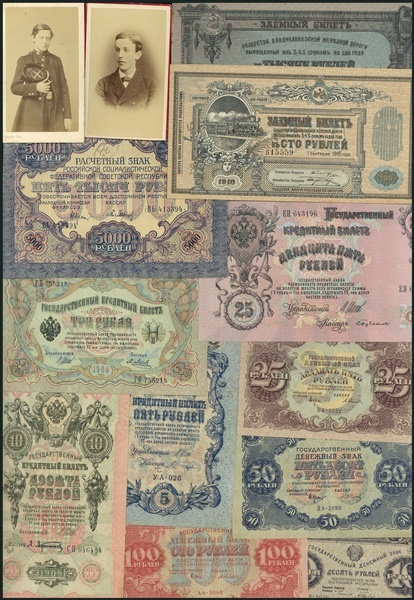 A large group of Russian notes, including, 500 rubles (1), 1919, Pick S440, 1000 rubles, 1919, Pick S424, 1 ruble (3), 1915 (old date 1898), 5, 10 and 25 rubles (1), 1923, Pick 164-166, 1000 rubles (4), 1919, Pick S418, Georgia, 100 rubles (2), Pick 12, 1000 rubles (3), 1917, Pick 37, 5000 and 10,000 rubles, 1919, Pick 105, 106, 3 and 5 rubles, 1918, Pick S409, S410, 10,000 rubles, 1919, Pick 106, 10,000 rubles (2), 1918, Pick 97, 250 rubles (2), 1918, Pick 93, 100, 250 and 500 rubles, 1920, Pick S432-S434, 5000 rubles, 1919, Pick S419, Treasury Certificate 1,000,000 rubles, 1921, Pick 120, 50 rubles (3), 1899, Pick 8, 100 rubles (3), 1898, Pick 5, 500 rubles (2), 1898, Pick 6, 25 rubles (2), 1909, Pick 12, 100 rubles (3), 1910, Pick 13, 500 rubles (3), 1912, Pick 14, 5000 rubles, 1921, Pick S612, 10,000 rubles, 1922, Pick S614, 1000 (2), 10,000 (2), 100,000 (1), 25,000 (1), 250,000 (1), 500,000 (1), 1,000,000 (1), 25,000,000 (1) 50,000,000 (1), 100,000,000 (1), 1 (2), 3, 5 (2), 10 chervonstev, 1937, Pick 202-205, 1 (2), 3, 5 rubles, 1938, Pick 213-215, 10, 25 rubles, 1947, Pick 225, 226, 10 (2), 25 (2), 50 (2) and 100 (2) rubles, 1961, Pick 233-236, 50 (2), and 100 (2) rubles, 1991, Pick 241, 242, 25 (2) and 100 (2) rubles, 1918, Pick 39Aa, 40, 3 (3), 5 (2), 10 (2), 25 (2), 50, 100, 250 (2), 500, 1000, Pick 86-95, 1, 10, 25, 50, 100, 1000 rubles, 1923, Pick 163, 165-168, 170, 500, 1000 rubles, 1921, Pick 111, 112, 100, 250, 500 rubles, 1920, Pick S432-434, 50, 100, 500, 1000 rubles, 1918, Pick 91, 92, 94, 95, 1000 rubles (2), 5 rubles (2), 1898, Pick 3, 5 (3), 10 (3) rubles. 1090, Pick 5, 10, 25 rubles, 1909, Pick 12, 3 rubles (9), 1905, Pick 9, 500 (2), 5000 rubles, 1919, Pick S415, S419, 5000 rubles, 1919, Pick 105, 25000 rubles, 1921, Pick S715, 1000 rubles (2), 1920, Pick S711, S712, 50000 rubles, 1921, Pick 716, 50, 100, 1000 rubles, 1918, Pick S593, S594, S596, Postage stamp currency, 3 kopeks, 1915, Pick 20, Postage stamp currency 10, 15, 20 kopeks, Pick 21-23, Postage stamp currency, 1, 2 kopeks, 1917, Pick 32, 33, together with an additional 150 notes and a small group of photographs