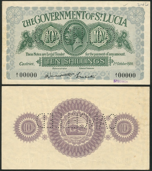 (†) Government of St Lucia, specimen 10 shillings, Castries, 1 October 1920, serial number A/1 00000, blue-grey and green, George V at centre, flanked by values, signatures of Davidson-Houston and Mackie, reverse mauve, arms with islands and towers at centre, flanked by values, perforated CANCELLED