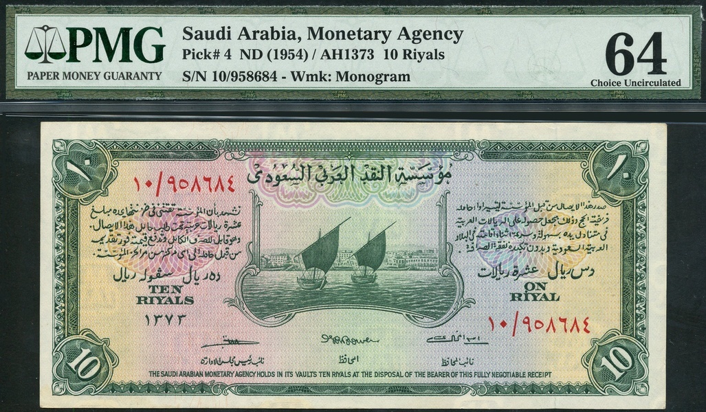 (x) Saudi Arabian Monetary Agency, Haj Pilgrim Receipt, 10 riyals, ND (1954), serial number 10/958684, green on light yellow, pink and blue, boats at centre, Jiddah harbour in background, reverse, arms at left and right