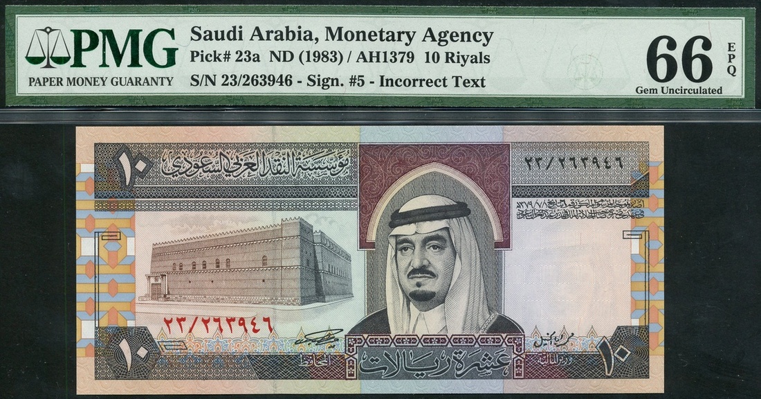 Saudi Arabian Monetary Agency, 10 riyals, ND (1983), serial number 23/263946, brown on multicolour underprint, King Fahd at centre, al-Murabah Palace in Riyadh at centre left, reverse, palm trees