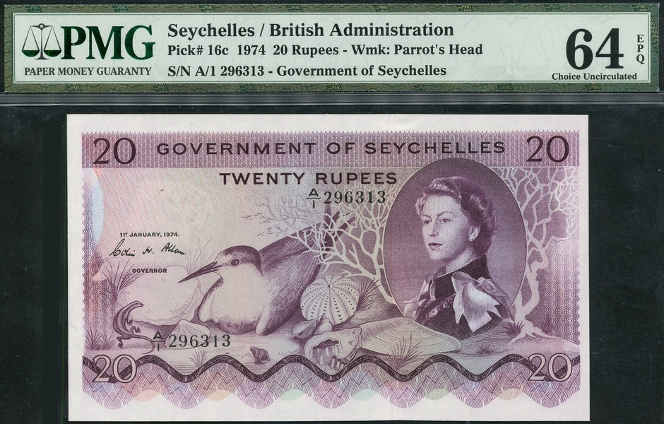 Government of Seychelles, 20 rupees, 1 January 1974, serial number A/1 296313, purple, portrait Queen Elizabeth II at right, sooty tern bird, lizard and sea shells, value in each corner and top centre, reverse, guilloche patterns