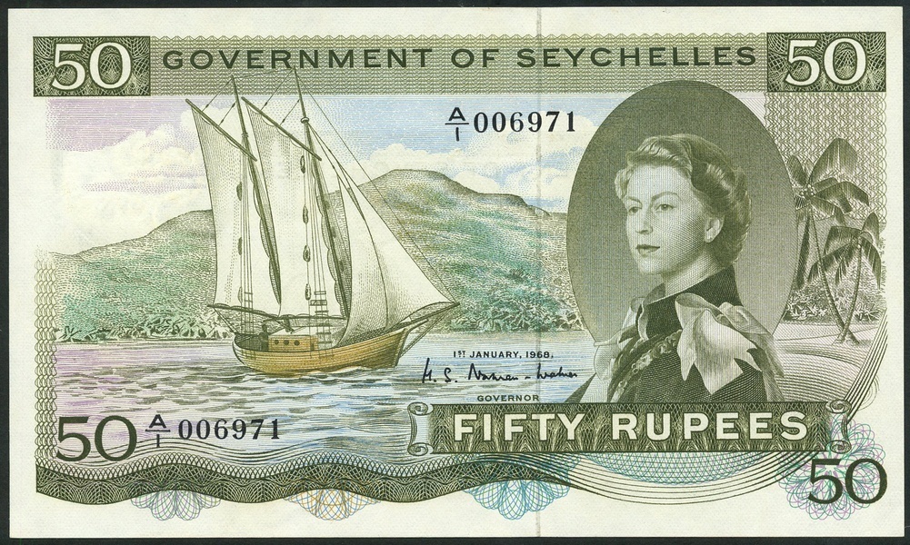 Government of Seychelles, 50 rupees, 1 January 1968, serial number A/1 006971, olive green on multicolour underprint, portrait Queen Elizabeth II at right, boat in full sail at centre, mountains in background, reverse, guilloche patterns in green. pink and blue