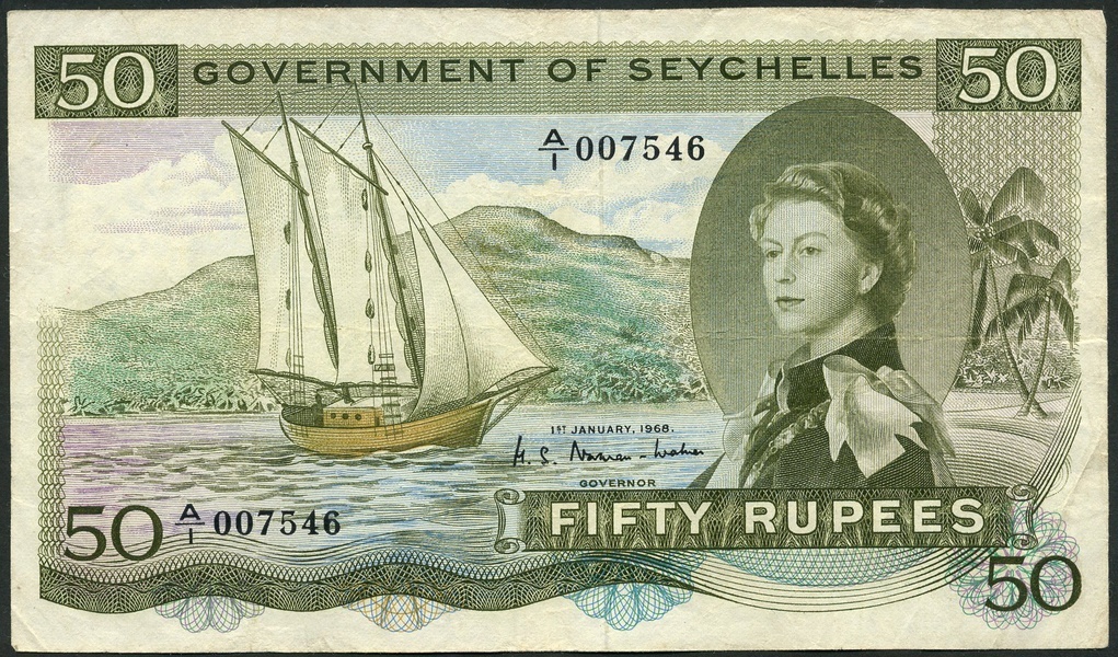 Government of Seychelles, 50 rupees (3), 1968, 1973(2), green, Elizabeth II at right, sailing boat at left, Norman-Walker and Greatbatch signatures, 'SEX' in palm fronds
