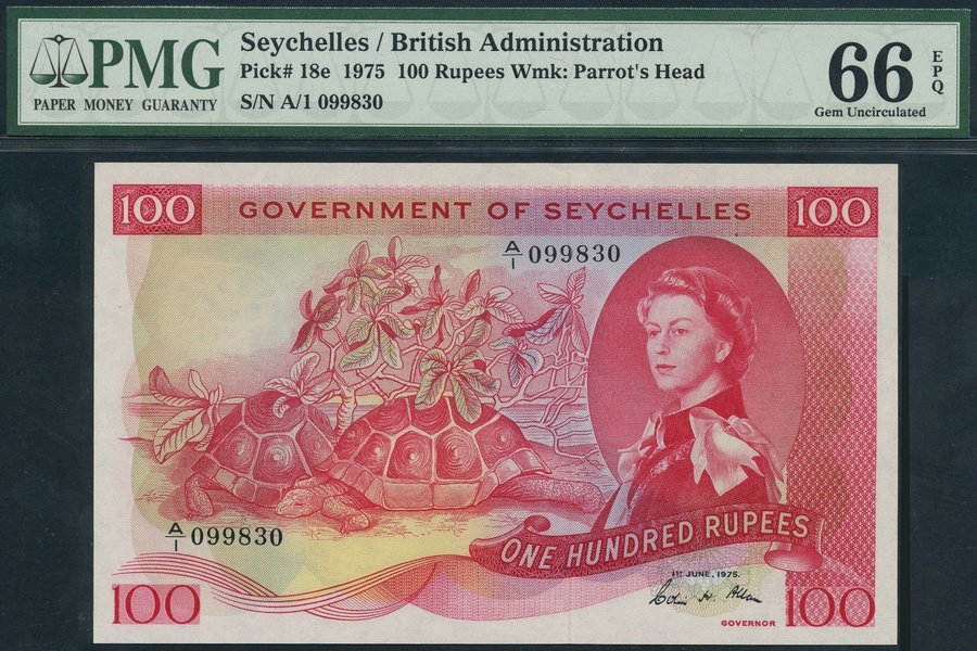 Government of Seychelles, 100 rupees, 1 June 1975, serial number A/1 099830, red on pastel underprint, portrait Queen Elizabeth II at right, two giant tortoises under a veloutye shrub, reverse, pink and blue guilloche patterns