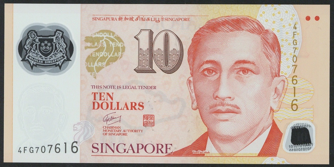 Singapore, $2 (5), ND, various prefixes, matching serial numbers 120949, purple on multicolour underprint, also, $10 (5), ND, various prefixes, matching serial numbers 707616, red on multicolour underprint, both denominations feature portrait Yusof bin Ishak at centre right