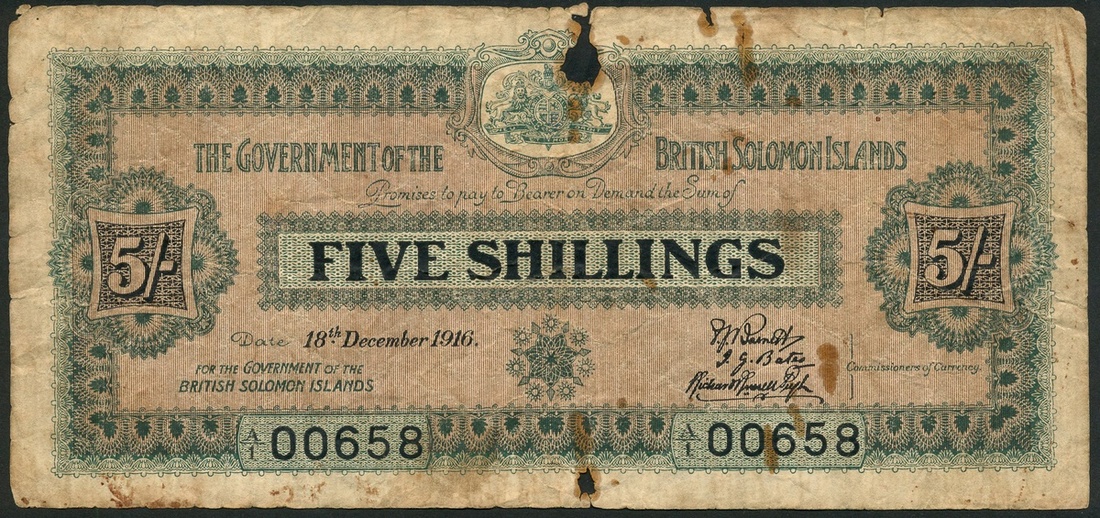 Government of the British Solomon Islands, 5 shillings, 10 December 1916, serial number A/1 00658, uniface, olive green on light tan and blue underprint, arms top centre, value right, left and in tablet at centre, ornate border