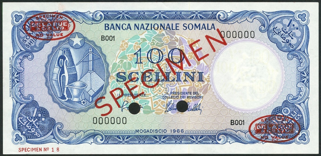 (x) Banca Nazionale Somalia, a specimen set from the 1966 issue, 10 shillings, green, cotton plant at left, 20 shillings brown, banana plant, 100 shillings, blue, vase and statue in oval at right, all with zero serial number, red SPECIMEN overprint and hole punched