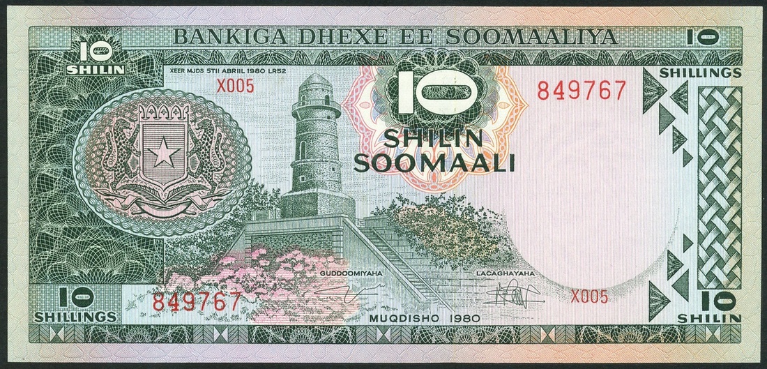 Central Bank of Somalia, 5 shillings, 1978, serial number T004 911551, maroon on multicolour, water buffalo low centre, coat of arms at left, reverse, banana harvesting scene, 10 shillings (2), 1980, consecutive serial numbers X005 849767/8, minaret of Abdul Aziz mosque at centre left, reverse, boat construction at centre, ornate panel at left and right