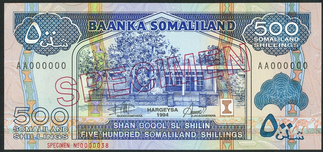 (x) Baanka Somaliland, specimen 5, 10, 20, 50, 100 and 500 Somaliland shillings, 1994, all zero serial numbers, all with red SPECIMEN overprint, a specimen set from 1996 gold commemorative issue, a specimen set from the 1996 commemorative silver issue, various colours on multicolour underprints, first four with Great Kudu at right, building at centre, reverse camel traders, last with building at centre, reverse sheep and ships