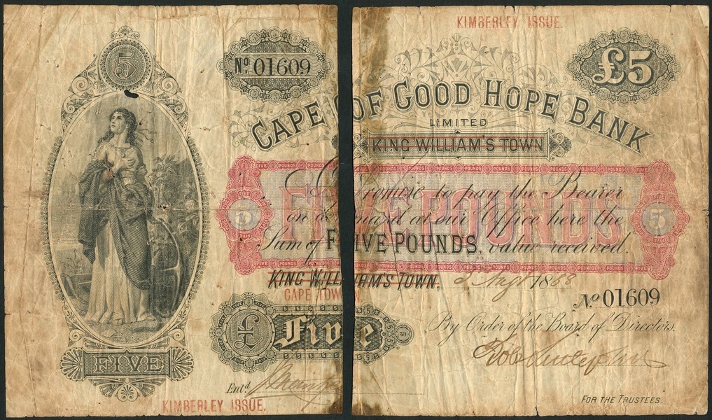 Cape of Good Hope Bank, South Africa, £5, 3 August 1888, serial number 01609, black and white, allegorical maiden at left, value in p[ink at centre right