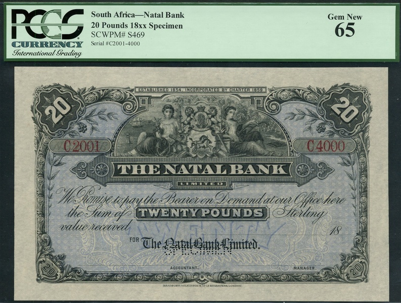 Natal Bank Limited, printers archival specimen £20, ND (18--), serial number run C2001-C4000, black on blue underprint, coat of arms and allegorical maidens at top centre surrounded by ornamental leaves and value, reverse blue, perforated SPECIMEN