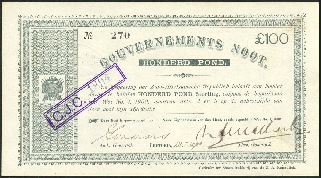 Gouvernements Noot, South African Republic, £100, Pretoria, 28 May 1900, serial number 270 grey-green and white, arms of the Republic at left, value in green tablet top centre, manuscript signatures of J.S.Marais the Auditor-General low left, N.S.Malherbe, the Treasurer-General low right