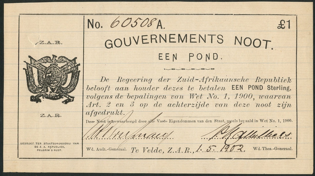 Gouvernements Noot, South African Republic, 1 pond, Te Velde (field note), 1 May 1902, serial number 60508A, black and white, arms of the Republic at left, manuscript signatures of the Acting Auditor-General A.P.Brugman and the Acting Treasurer-General P.R.de Villiers