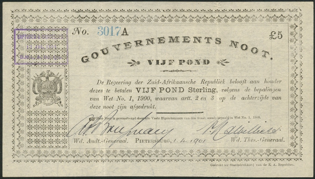 Gouvernements Noot, South African Republic, 1 pond , Pietersburg, 1 April 1901, serial number 13230A, and 5 pond, 1 April 1901, serial number 3017A, both black and white, arms of the Republic at left, manuscript signatures of the Acting Auditor-General A.P.Brugman and the Acting Treasurer-General P.R.de Villiers, purple 'CAPTURED AND CANCELLED 11th JULY 1901 D.M.I., A.Hd.Qrs' handstamp at top left