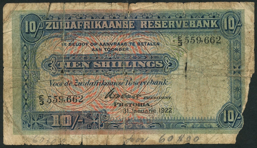 (x) South African Reserve Bank, 10 shillings, 31 January 1922, serial number E/3 559662, blue and multicoloured, value in tablet at centre, and at each corner, reverse red