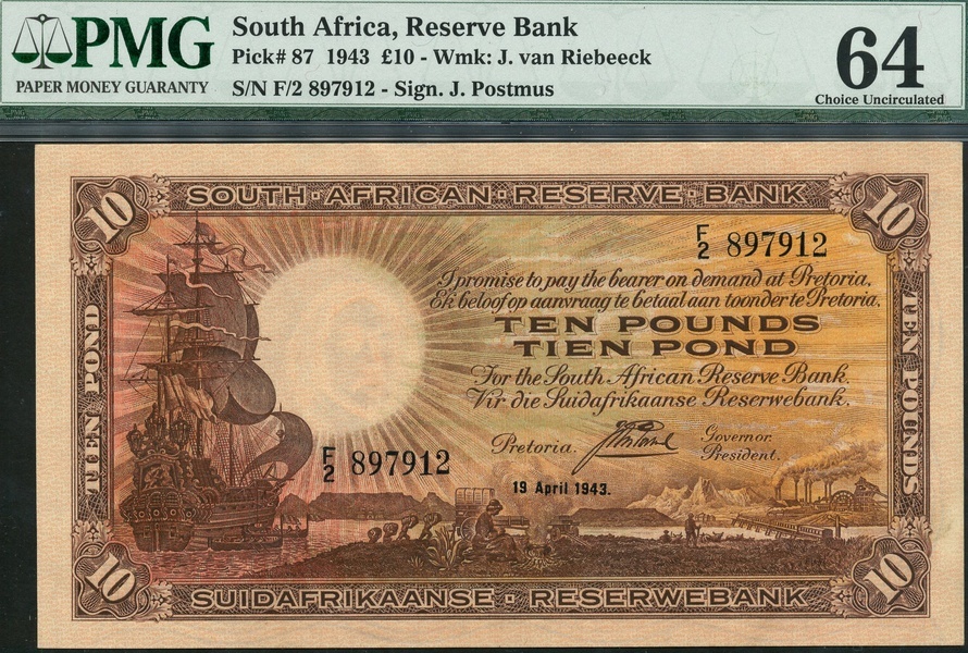 South African Reserve Bank, £10, 19 April 1943, serial number F/2 897912, brown on multicolour underprint, ship in full sail at left, factories at right, value and bank title within ornate border, reverse, arms at centre flanked by bank title in English and left and Afrikaans at right