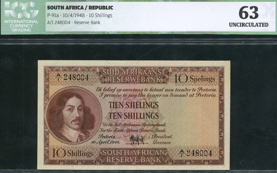 South African Reserve Bank, 10 shillings, 10 April 1948, serial number A/1 248004, brown on multicolour underprint, portrait Jan van Riebeeck in circular frame at left, value low left, top right and at centre, reverse, lion at centre flanked by bank title in English at left and Afrikaans at right