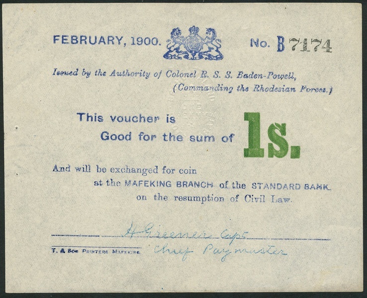 Siege of Mafeking, 1 shilling, February 1900, serial number B 7174, blue text on white paper, arms top centre, value in green at right, embossed seal of the Bechuanaland Protectorate at centre, facsimile signature in blue of Capt.H.Greener, the Chief paymaster, low right