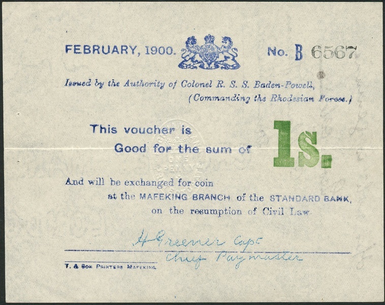 Siege of Mafeking, 1 shilling, January 1900, serial number B 6567, blue text on white paper, arms top centre, value in green at right, embossed seal of the Bechuanaland Protectorate at centre, facsimile signature in blue of Capt.H.Greener, the Chief paymaster, low right