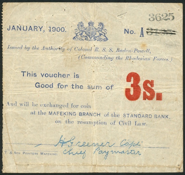 Siege of Mafeking, 3 shillings, January 1900, serial number A 3195 altered to 3625, blue text on white paper, arms top centre, value in red at right, embossed seal of the Bechuanaland Protectorate at centre, facsimile signature in blue of Capt.H.Greener, the Chief paymaster, low right