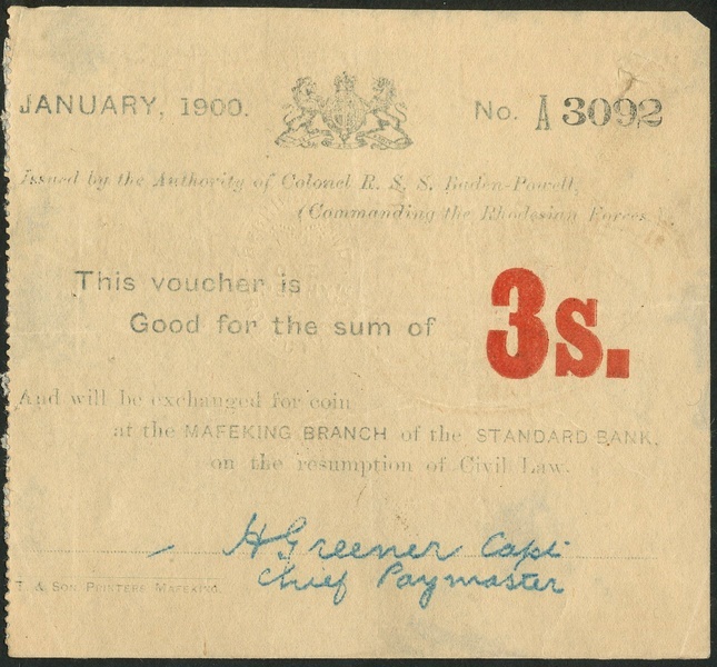Siege of Mafeking, a group comprising 1/-, 1900, 2 shillings, 1900, 3 shillings, 1900 and two 10 shillings, 1900, green and white, field gun at low left and right, 'Commaning' error on both