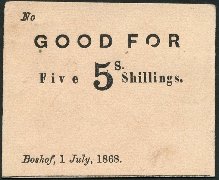 South Africa, Boshof, unissued 5/-, 1 July 1868, black text on pale pink card