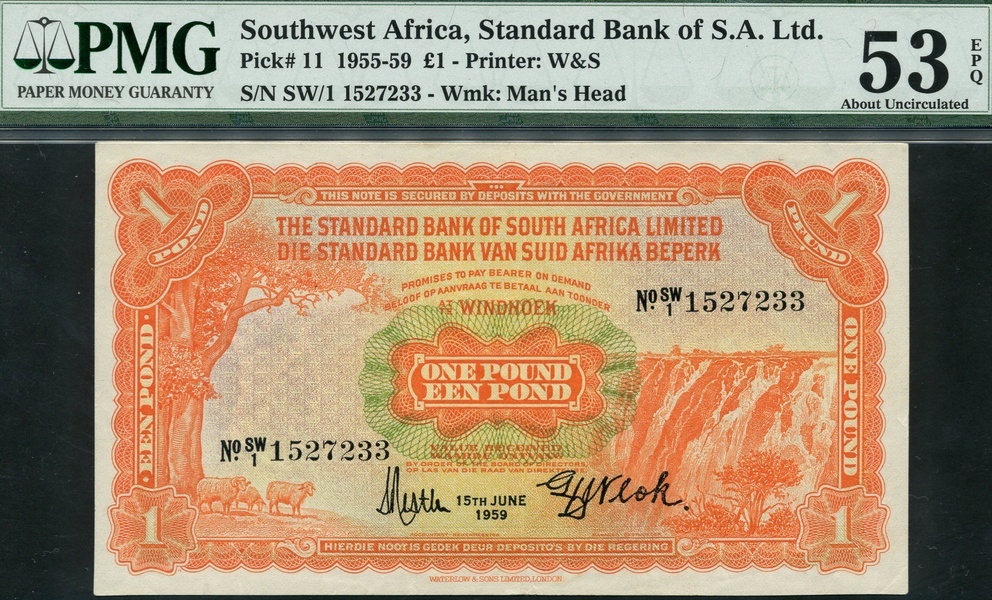 South West Africa, £1, 15 June 1959, serial number SW/1 1527233, orange and green, Ruacana Falls on the Kunene River at right, sheep low left, reverse, kudu antelopes, mountains in background