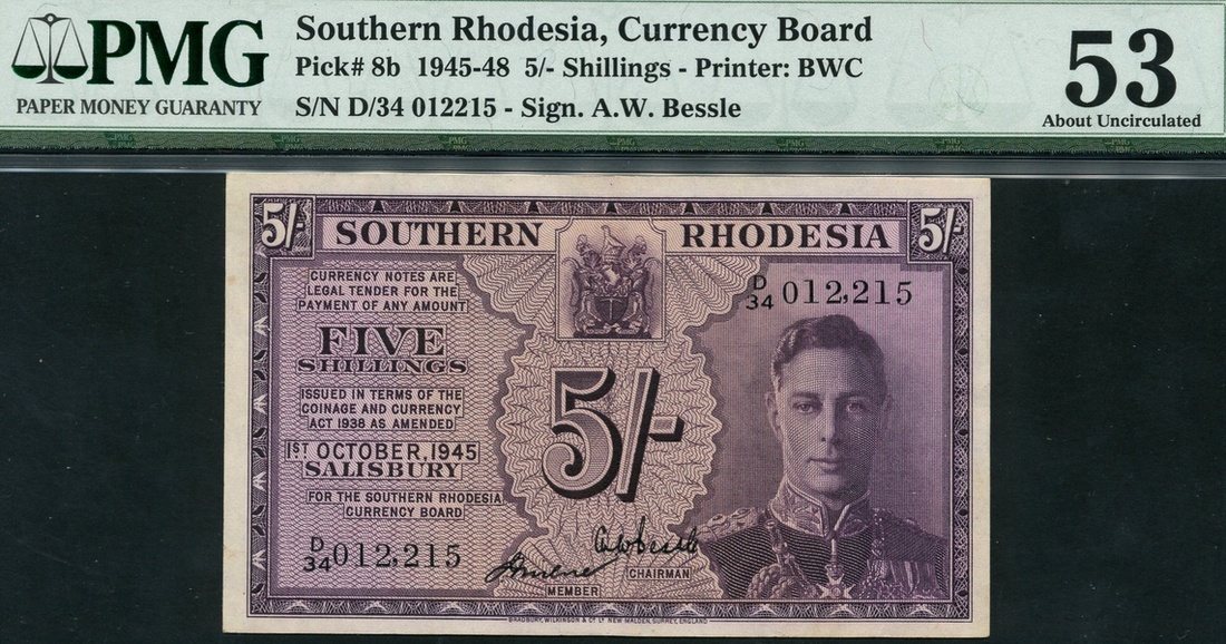 Southern Rhodesia, 5 shillings, 1 October 1945, serial number D/34 012,215, purple, portrait King George VI at right, coat of arms top centre, value at top left, right and at centre, reverse, guilloche patterns