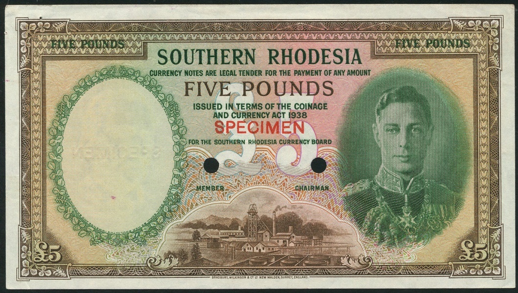 Southern Rhodesia, colour trial £5, ND, no serial number, brown on multicolour underprint, portrait King George VI at right, colliery buildings low centre, value in each corner and at centre, reverse, sable antelope at left, Victoria Falls at centre