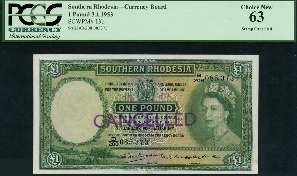 Southern Rhodesia, £1, 3 January 1953, serial number B/208 085373, green on multicolour underprint Elizabeth II at right, arms at top centre, reverse, Zimbabwe Ruins at centre, purple CANCELLED handstamp on both sides