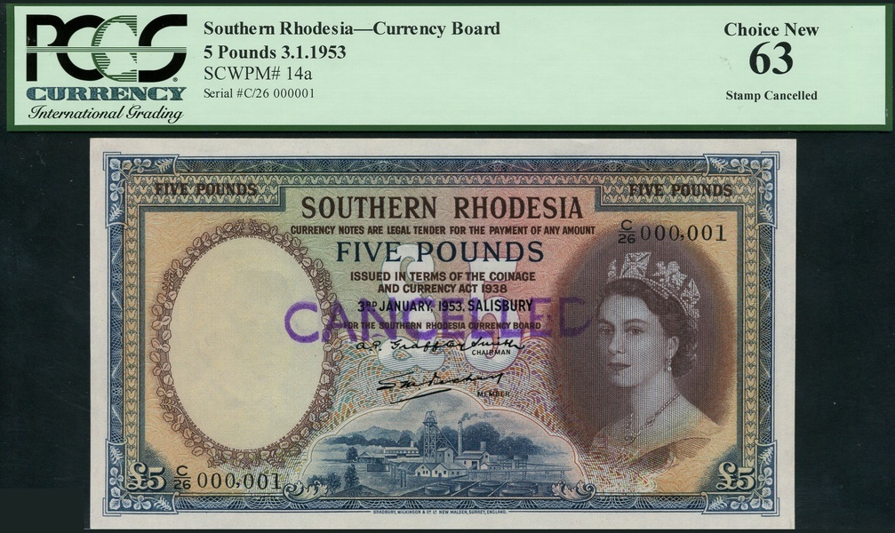 Southern Rhodesia, £5, 3 January 1953, serial number C/26 000001, blue and brown on multicolour underprint, Elizabeth II at right, Wankie Colliery at low centre, reverse, Victoria Fall at centre, purple CANCELLED handstamp on both sides