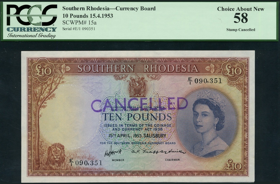 Southern Rhodesia, £10, 15 April 1953, serial number E/1 090351, brown and purple on multicolour underprint, Elizabeth II at right, lion at low left, arms at top centre, reverse, green, Elephants at centre, purple CANCELLED handstamp on both sides