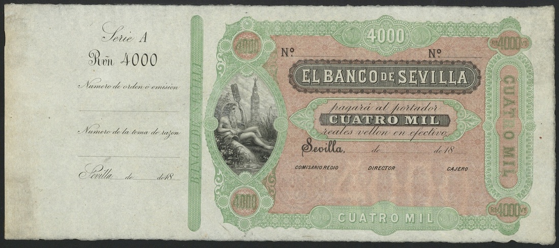 (†) El Banco de Sevilla, specimen 4000 reales vellon, 18-, no serial numbers, large format with counterfoil, black, pink and green, river god and tower at left, value at top centre and each corner, counterfoil at left