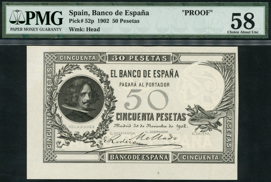 (x) El Banco de Espana, proof 50 pesetas, 1902, no serial number, uniface, black and white, portrait Velazquez at left, paint palette and brushes at right