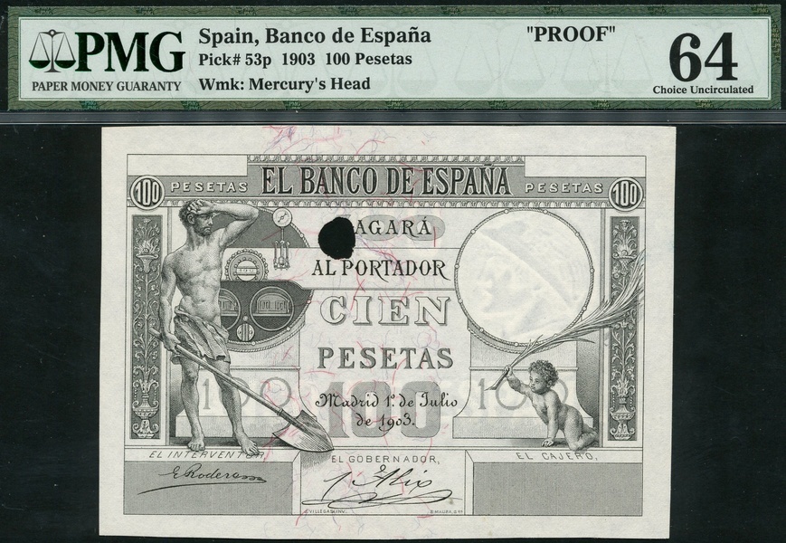 (x) El Banco de Espana, proof 100 pesetas, 1903, no serial number, uniface, black and white, allegorical figure at left, cherub at right, ornate panel at left and right