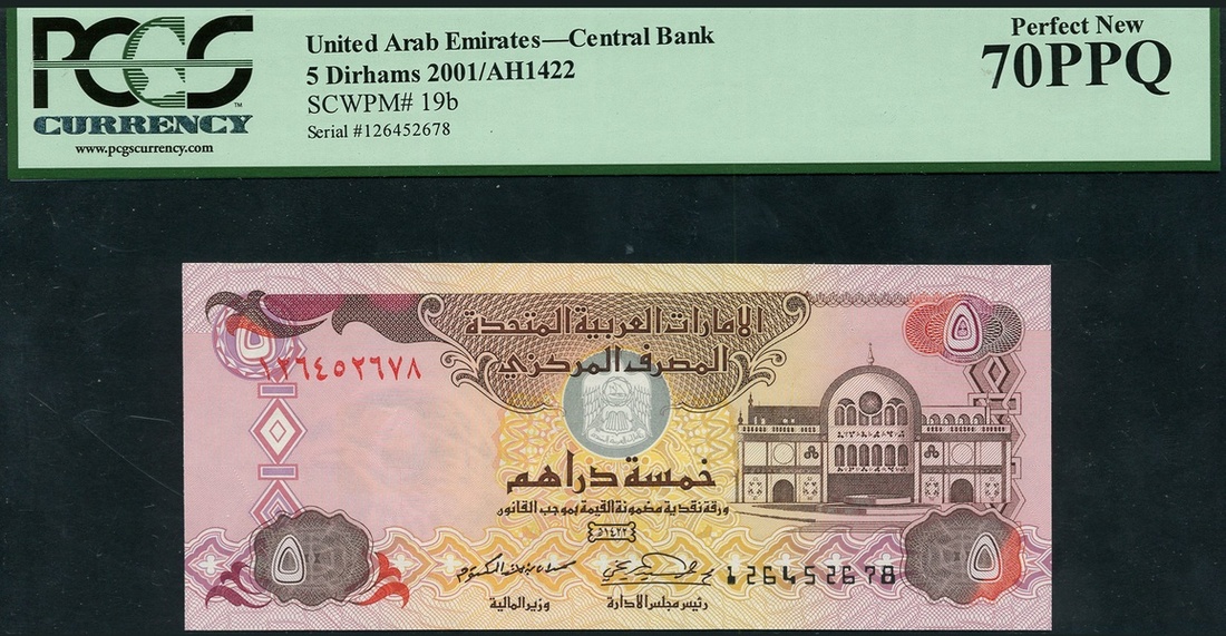 (x) United Arab Emirates Central Bank, 5 dirhams, 2001, serial number 126452678, red and dark brown, mosque at right, value at corners