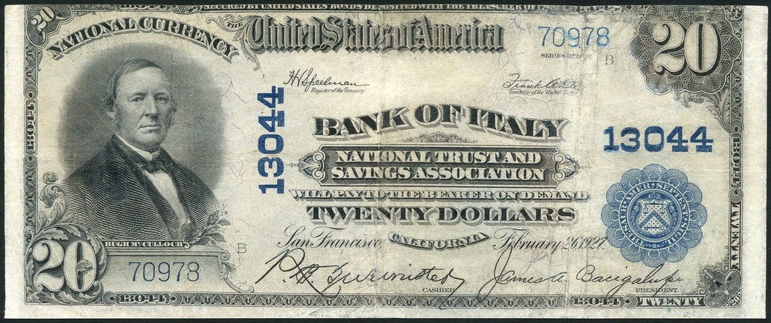 National Currency, Bank of Italy, National Trust and Savings Association, United States of America, $10, San Francisco, 26 February 1927, serial number 67229, blue Charter number 13044, black and white, William McKinley at left, also $20 (2), 26 February 1927, serial numbers 52163 and 70978, Hugh McCulloch at left, all are printed Speelman and White signatures, below are the signatures of Burnisted and Bacigalupi