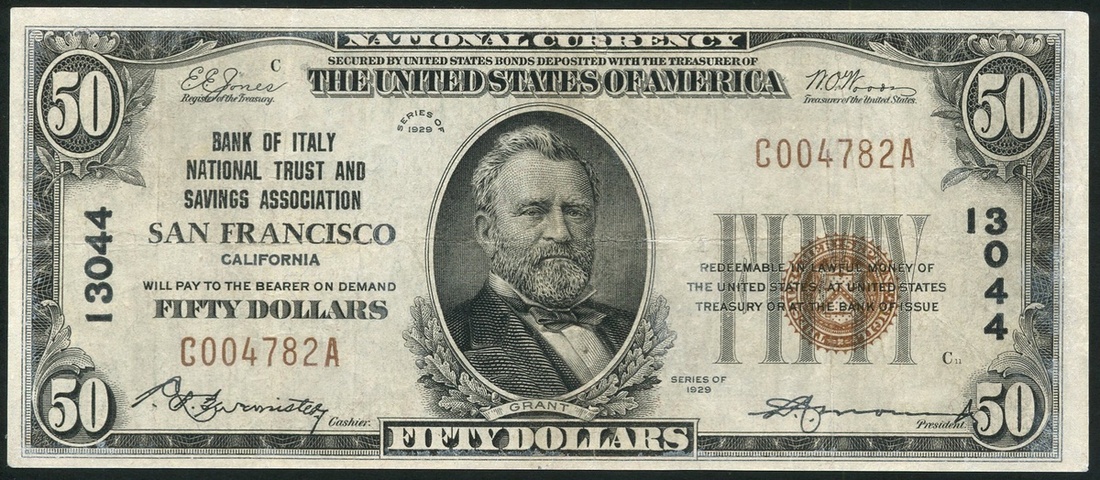 National Currency, Bank of Italy, National Trust and Savings Association, United States of America, $5, San Francisco, series of 1929, Lincoln, $10, Hamilton, $20, Jackson, $50, Grant and $100, Franklin, all series of 1929 with black charter number 13044, all are type I, black and white with brown seal at right, Jones and Woods signatures at top