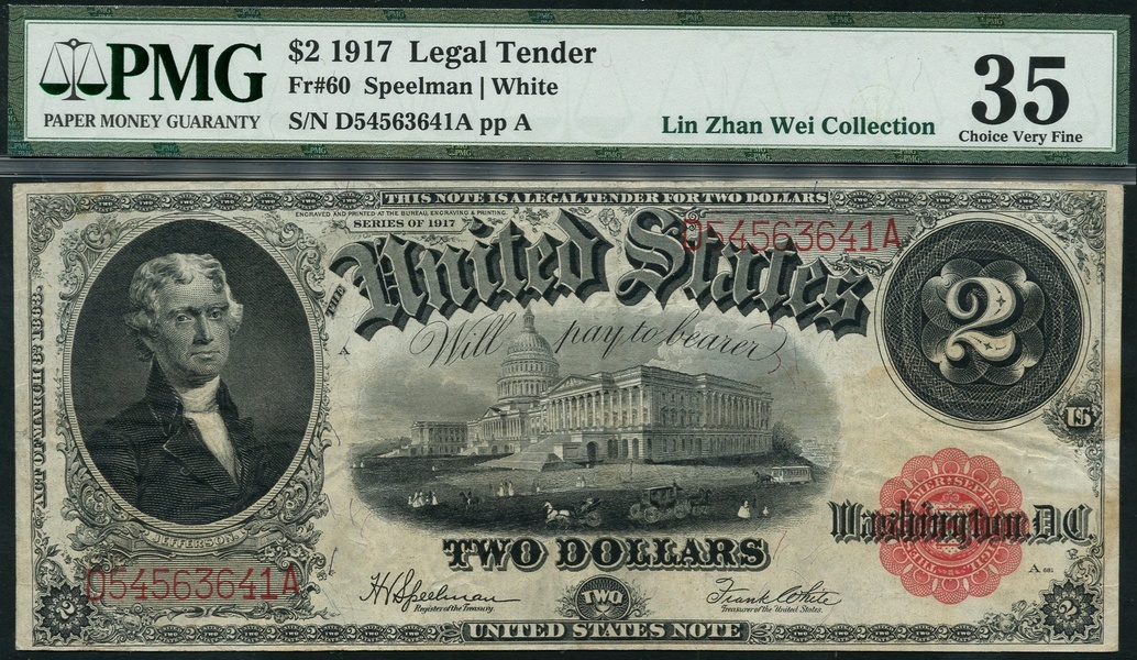 (x) USA, $2, 1917, serial number D54563641A, black and white, portrait Thomas Jefferson at left, White House at centre, red seal low right, Speelman/White signature