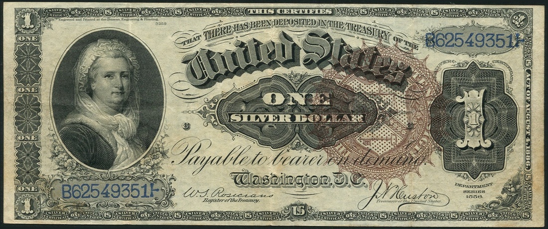 United States Silver Certificate, $1, series of 1886, blue serial number B62549351, black and white, Martha Washington at left, large brown seal at right, signatures of Rosecrans and Huston, reverse green