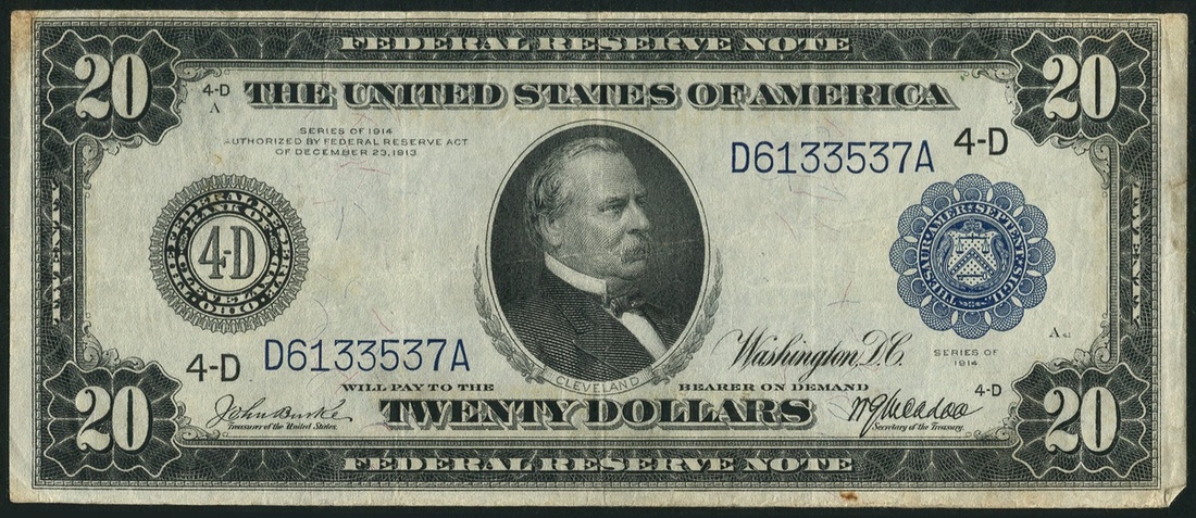 Federal Reserve Note, $20, 1914, serial number D6133537A, black print, portrait of Grover Cleveland at centre, blue seal at right