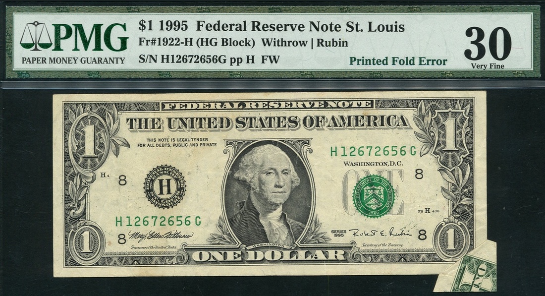 (x) USA, Federal Reserve Note, St Louis, ERROR: $1, 1995, serial number H12672656G, black and white, portrait George Washington at centre, green seal at right, Withrow/Rubin signature, also, error $5, Chicago, black and white, portrait Abraham Lincoln at centre, Granahan/Fowler signature