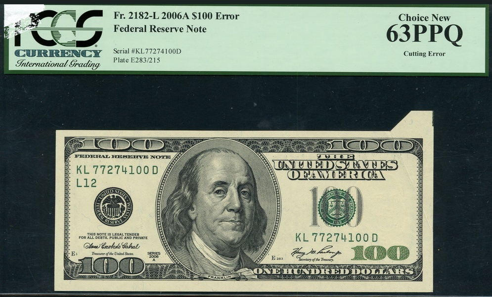 ERROR: Federal Reserve, U.S.A, $100, 2006A, prefix KL, black and white and green, Franklin at centre