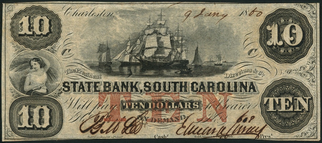 A selection of Civil War era notes comprising State of Louisiana $5 (2), 1863, State of Mississippi $10, 1862, County of Augusta 25 and 50 cents, 1862, State of North Carolina 50 cents, 1866, $3, 1863, Planters Bank of the State of Georgia, $4, 1864, State Bank of South Carolina, $10, 1860
